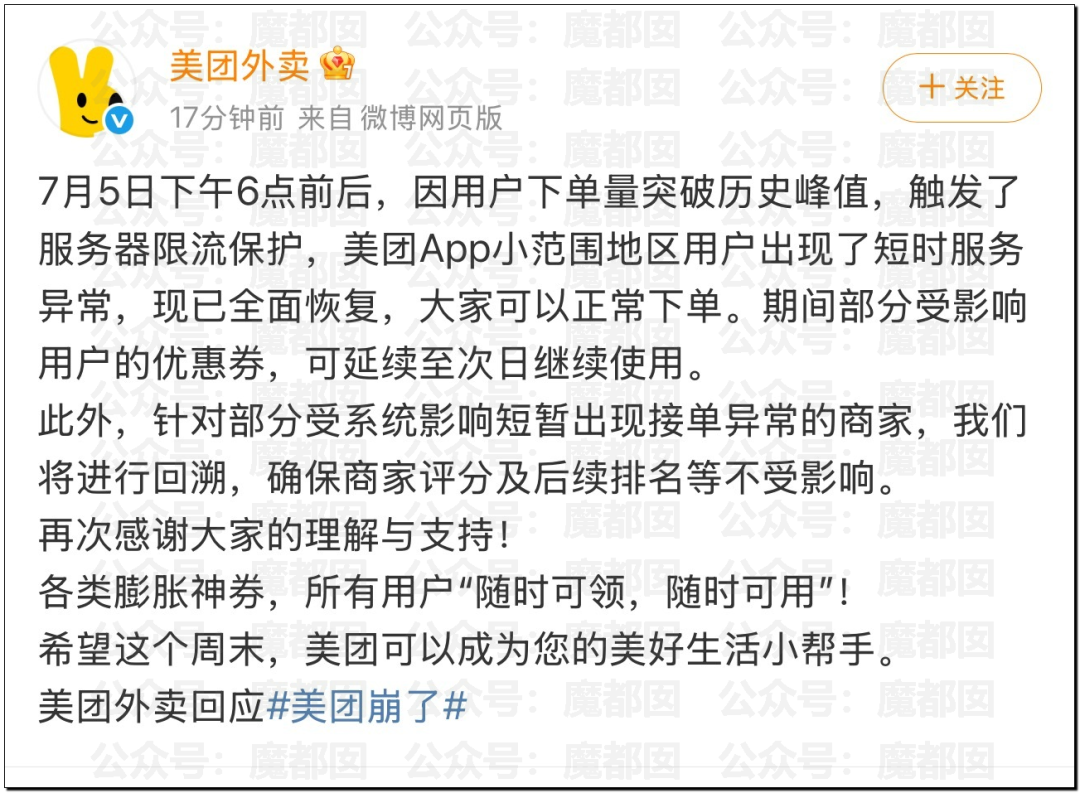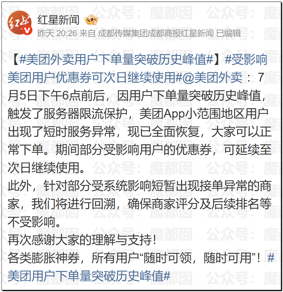 对此,美团方面回应称,7月5日下午6点前后,因用户下单量突破历史峰值,触发了服务器限流保护,美团App小范围地区用户出现了短时服务异常,现已全面恢复,大家可以正常下单。在此期间部分受影响用户的优惠券,可延续至次日继续使用。此外,针对部分受系统影响短暂出现接单异常的商家,“我们将进行回溯,确保商家评分及后续排名等不受影响”。