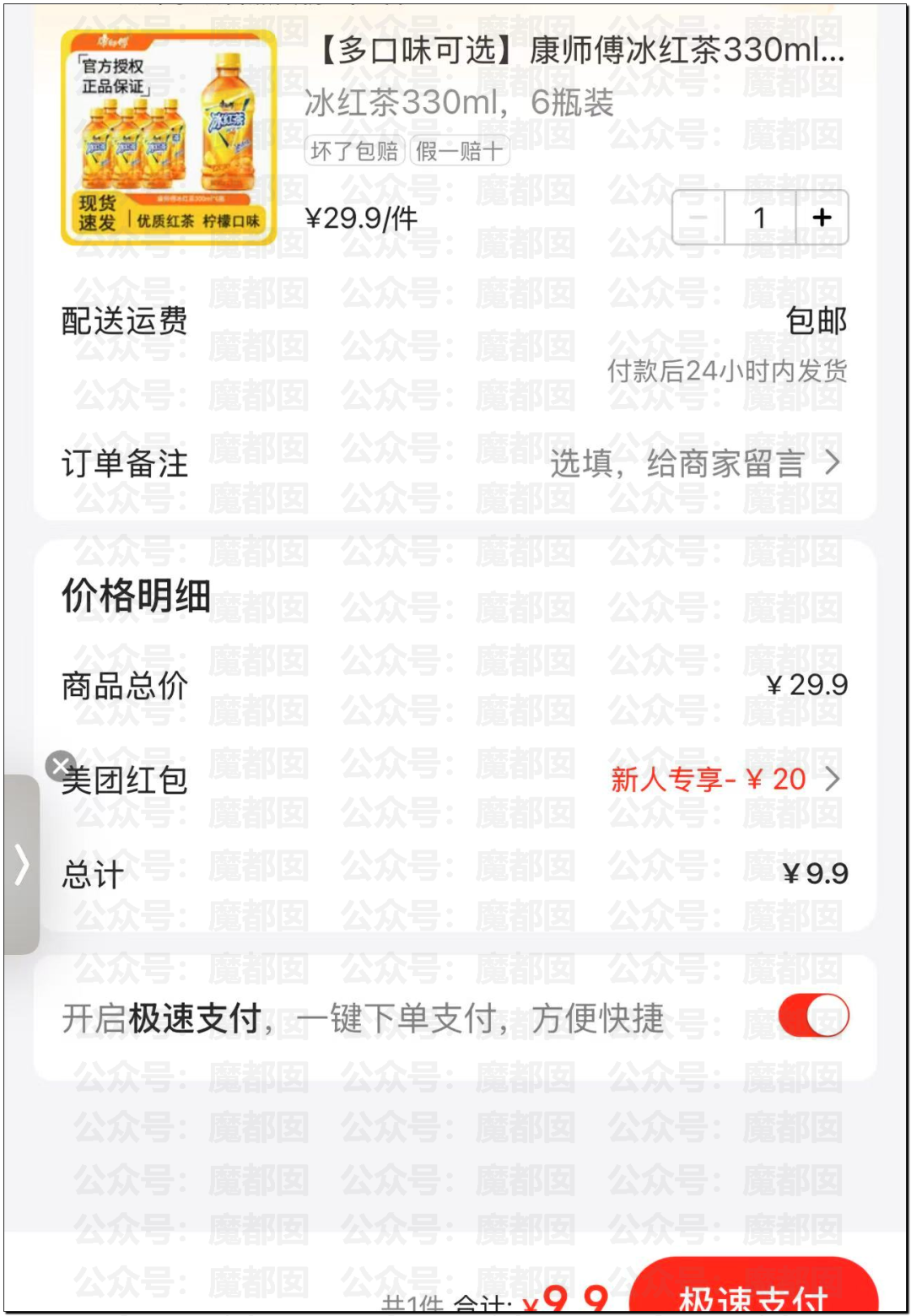 大家熟悉的康师傅冰红茶6听最终9.9元。