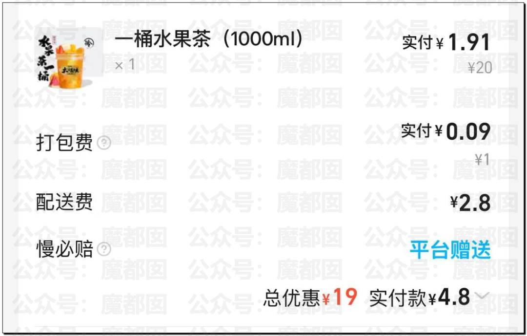 我们看了看价格是真的离谱,比如一桶水果茶最终4.8元。