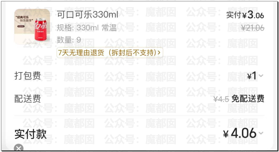 9瓶听装可口可乐最终只付4.6元。我们头皮都发麻了……一听可乐5毛钱……