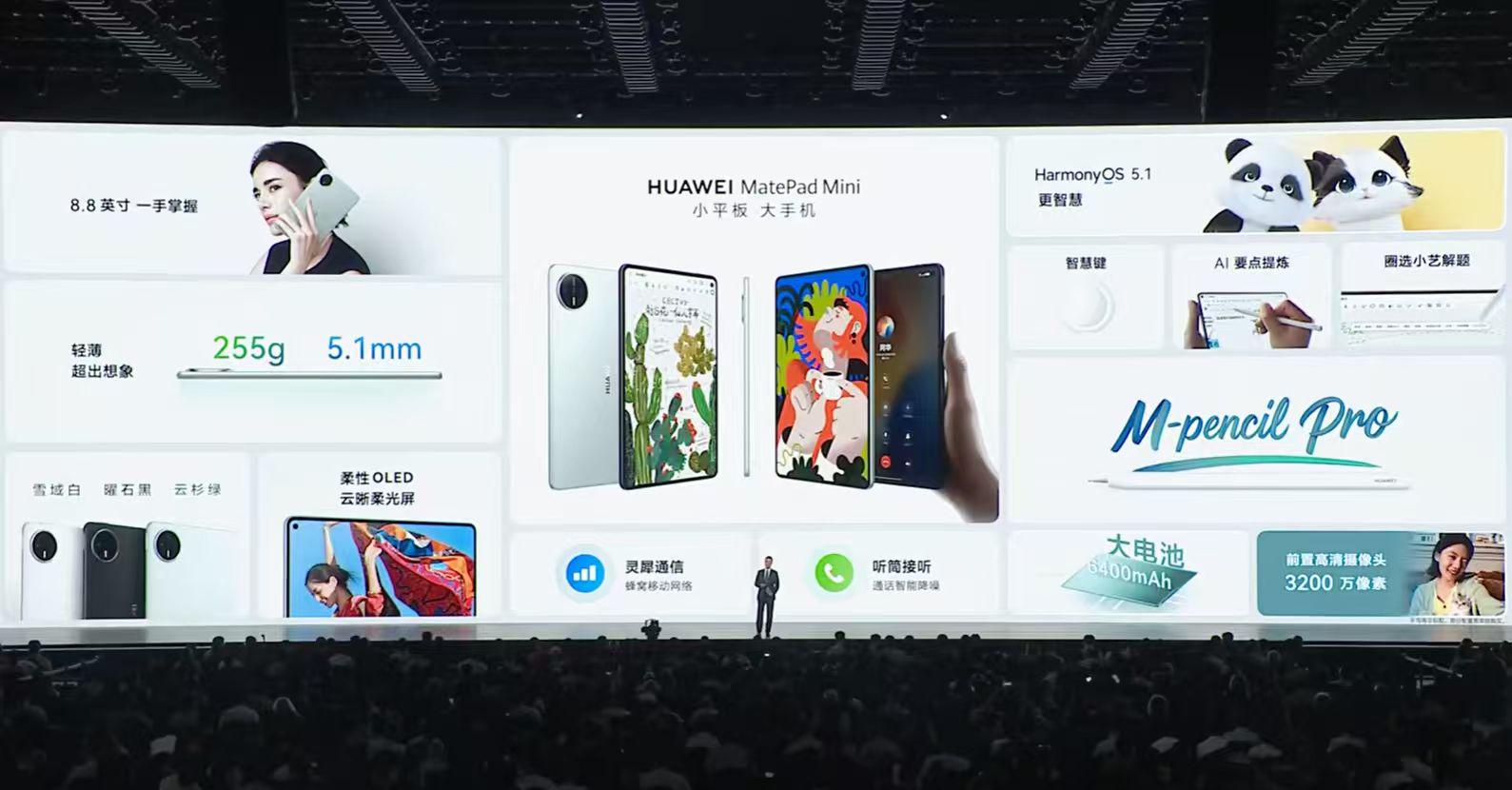 据发布会介绍,华为MatePad Mini搭载HarmonyOS 5.1系统,支持AI功能与小艺智能交互,可配合M-Pencil Pro实现手写与绘图操作。设备搭载3200万像素前置摄像头,具备高质量视频通话与拍摄能力,并内置大容量电池。