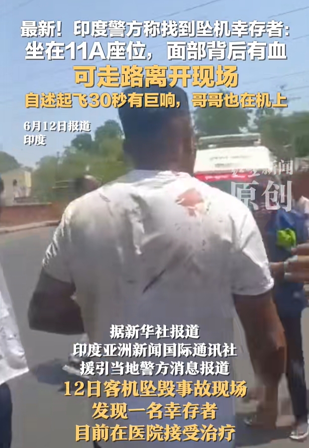 据印度“亚洲国际新闻社”援引来自艾哈迈达巴德警察局长的消息报道称,6月12日下午发生在当地的印度航空公司坠机事故中,警方“在编号11A的客舱座位处发现一名幸存者”,此人已被送往医院接受治疗。